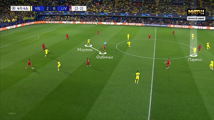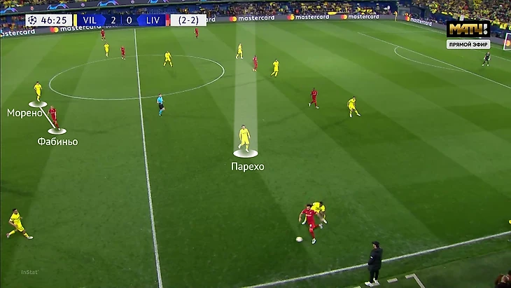 До перерыва испанец смело действовал по Вирджилу Ван Дейку – больше в его задачи ничего не входило, но благодаря поддержке партнеров форвард справлялся. Во втором «Вильярреал» опустился поглубже – и Морено приходилось перемещаться от Ван Дейка к Фабиньо: действовавший по бразильцу Дани Парехо чаще страховал защитников или помогал с выходом из обороны: