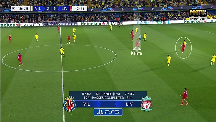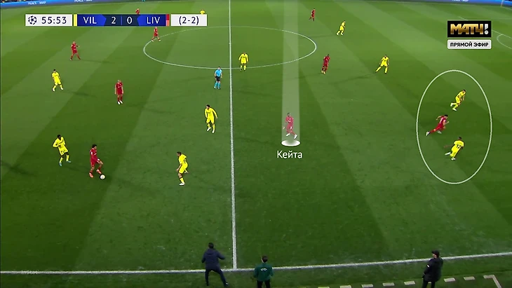 Смена позиций в попытке запутать «Вильярреал» тоже сыграла. Тут главным лицом стал Кейта. Он наконец-то получил свободу, но тоже не без помощи партнеров – они двигались таким образом, чтобы на него не смог выдвинуться соперник. Покажем на двух примерах с Салахом.