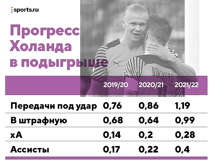 По ходу сезона мы отмечали, что норвежец прибавляет в подыгрыше. К концу кампании тренд приобрел еще более четкие очертания. По всем показателям, которые фиксируют вовлеченность игрока в розыгрыш, у Холанда значительный прогресс: