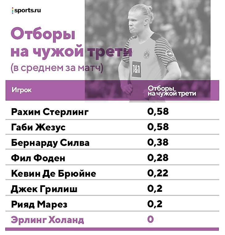 Участие в позиционных атаках – пожалуй, главный элемент, в котором Эрлингу придется прибавить. Второй – вовлеченность в прессинг. «Дортмунд» был прессингующей командой, но Холанду давали свободу в этой стадии. Показательно, что в этом сезоне у Эрлинга до сих пор ни одного отбора на чужой трети. Сравнение с атакующими игроками «Сити» слегка неуместно (никто не играл нападающего постоянно), но такая картина формирует понятную задачу норвежца на будущее. В «Сити» минимальной свободы нет даже у КДБ – главной звезды с аналогичной зарплатой.