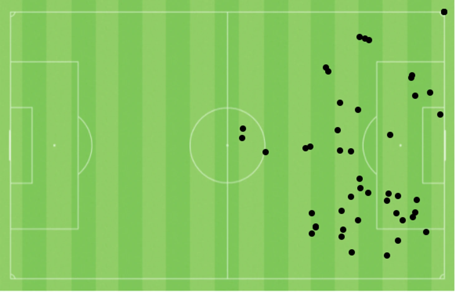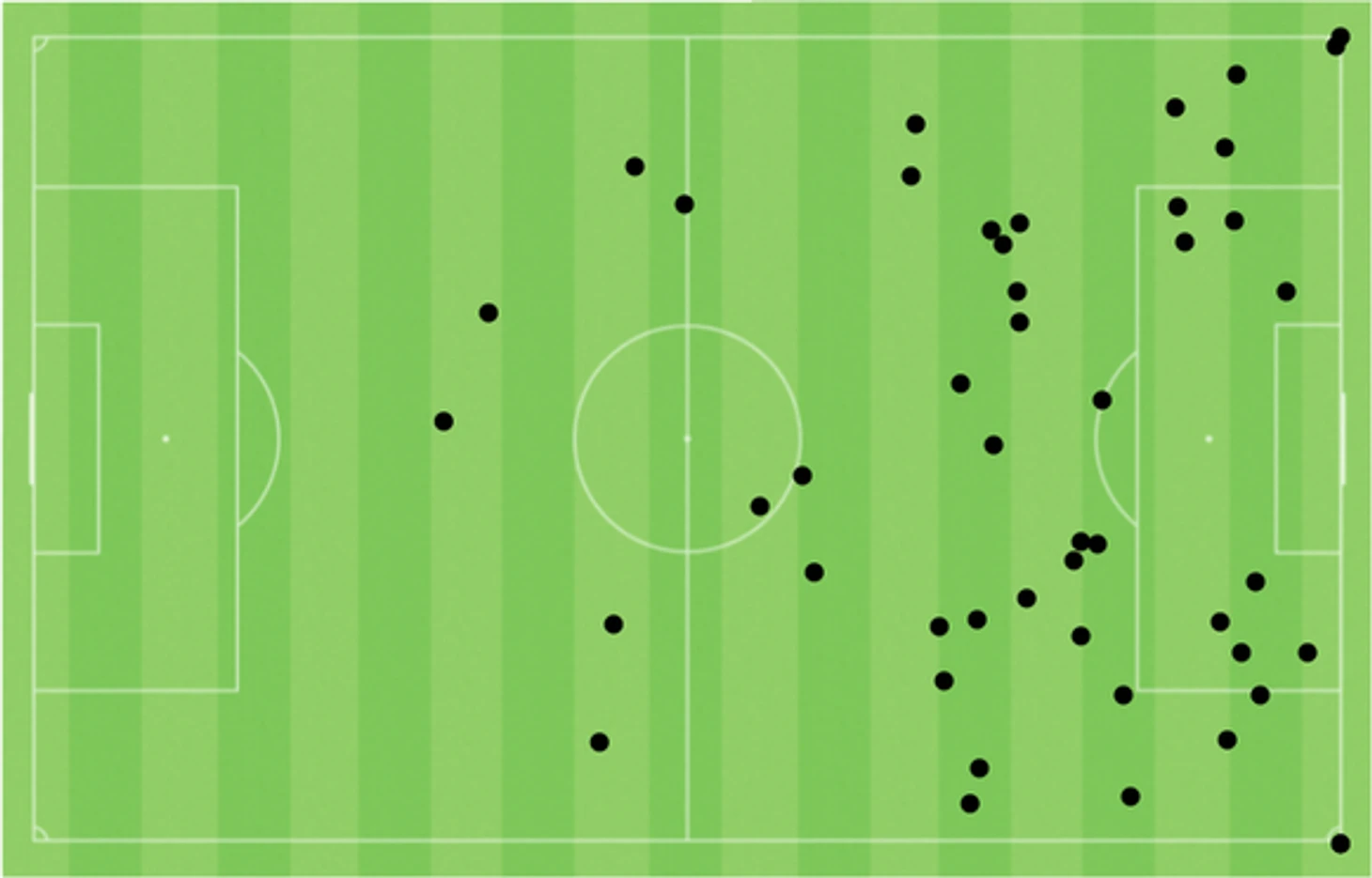 А вот карта голевых передач с сезона-2019/20. Почти все – на чужой трети поля, причем с явным акцентом на любимый правый фланг: