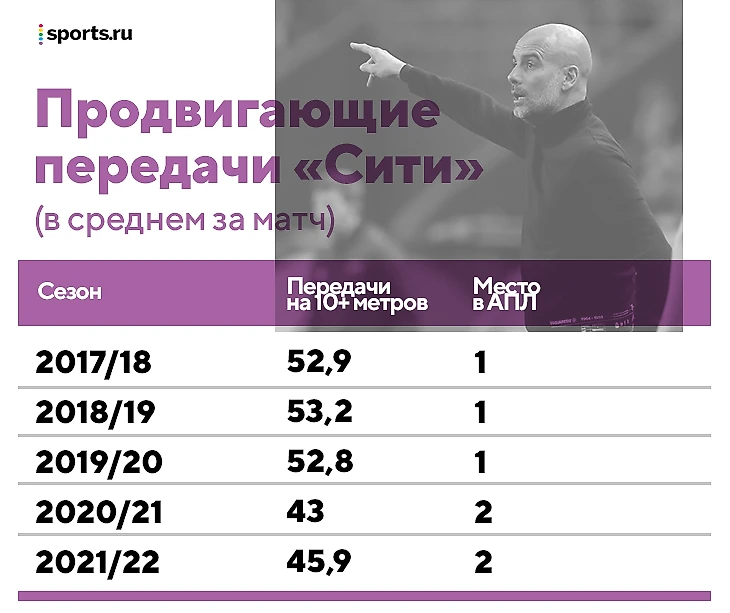 Хорошее отражение мегаконтроля – продвигающие передачи (должны отдаваться вперед и более чем на 10 метров). Их стало меньше по сравнению с первыми сезонами при Пепе. По этому показателю «Сити» даже уступил первое место в АПЛ «Ливерпулю»: