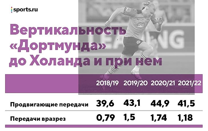 Благодаря наследию Клоппа и тренду Бундеслиги на прессинг «Боруссия» еще до прихода Холанда играла в вертикальном стиле. Но показательно, что приход Эрлинга даже радикализировал подход. Команда здорово под него подстроилась, лишь увеличив передачи удобного типа. В этом сезоне, часть которого Холанд пропустил из-за травм,  показатели слегка откатились назад – связь с Эрлингом тоже прослеживается.