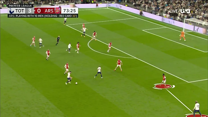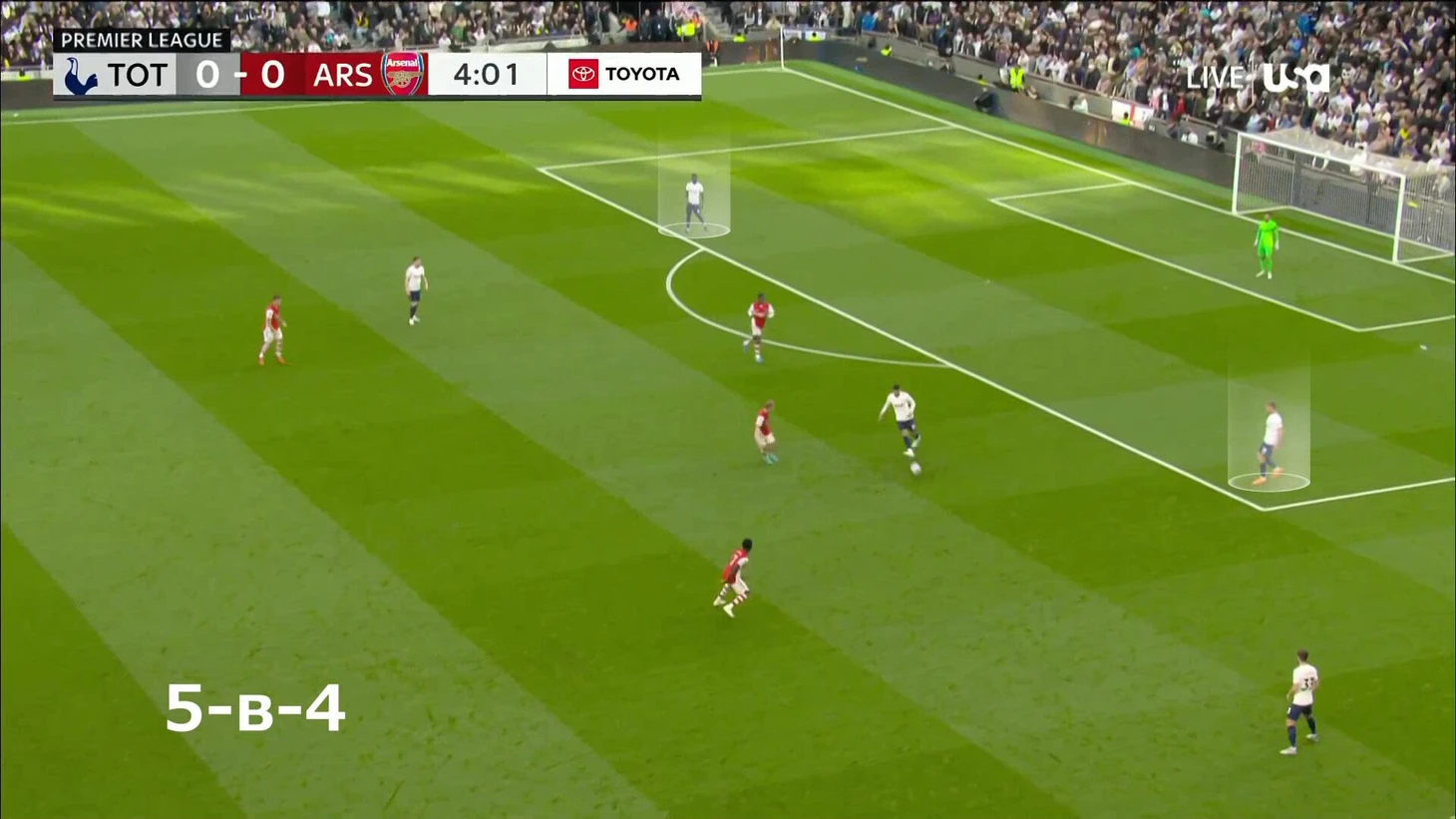 То есть «Арсенал» пытался встречать высоко, но при таких попытках преимущество было у «Тоттенхэма». Некоторые эпизоды с провалом прессинга завершались атаками 5-в-5 на половине «Арсенала»: