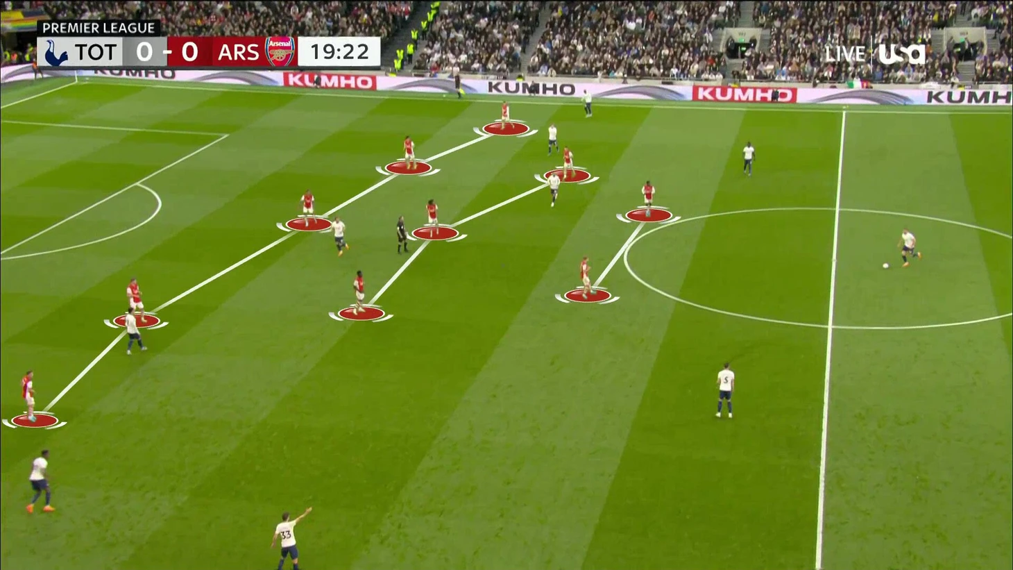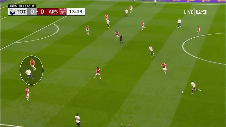Но не менее показательно – даже после того, как «Арсенал» сел в схему позиционной обороны, Холдинг остается прикованным к Сону (играет по позиции оппонента в большей степени, чем в рамках линии защиты):