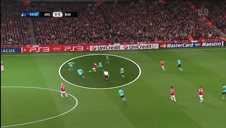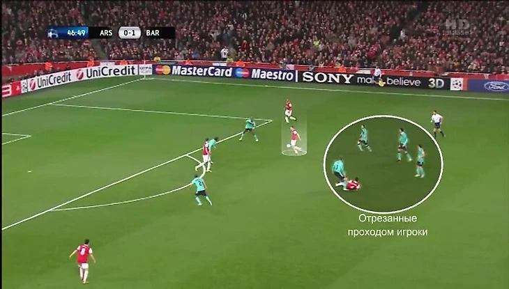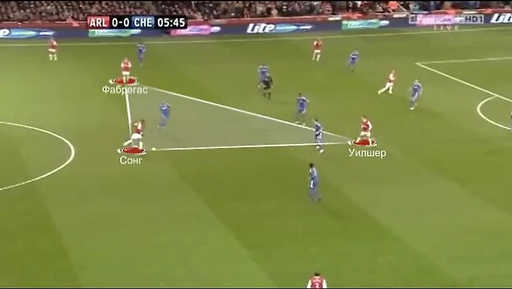 Соперники не справлялись с описанными ротациями. «Арсенал» крайне вариативно созидал из центральной зоны. Уилшер разрушал прессинг, разыгрывал стеночки и разрезал защиту из зоны десятки. Сонг делал рывки вперед и закидушки из глубины. Фабрегас был гением обостряющего паса – и мастерски чередовал дальние из глубины и разрезающие из чужой опорной. Диапазон угроз был слишком широким, а нейтрализовывать кого-то одного через плотную опеку было бессмысленно – рушилась оборонительная схема, двое других получили бы больше свободы.