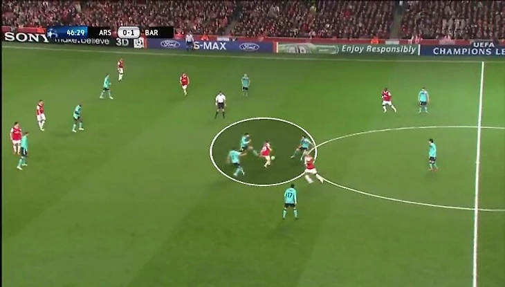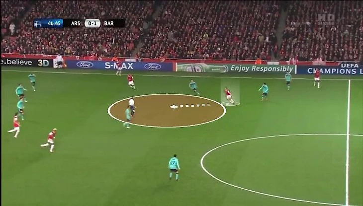 Центр с Уилшером и Фабрегасом в любой конфигурации испытывал бы проблему открытости. Сонг обладал качествами, чтобы разрушать, но никогда не был чистым разрушителем (слишком заточен на игру по мячу и плохо страхует). Он был ближе всех к роли опорника, но настоящего опорника в команде просто не было – роль Сонга тоже предполагала активное участие в ротациях. В момент потери он мог быть абсолютно в любой зоне и не давал никакого контроля.