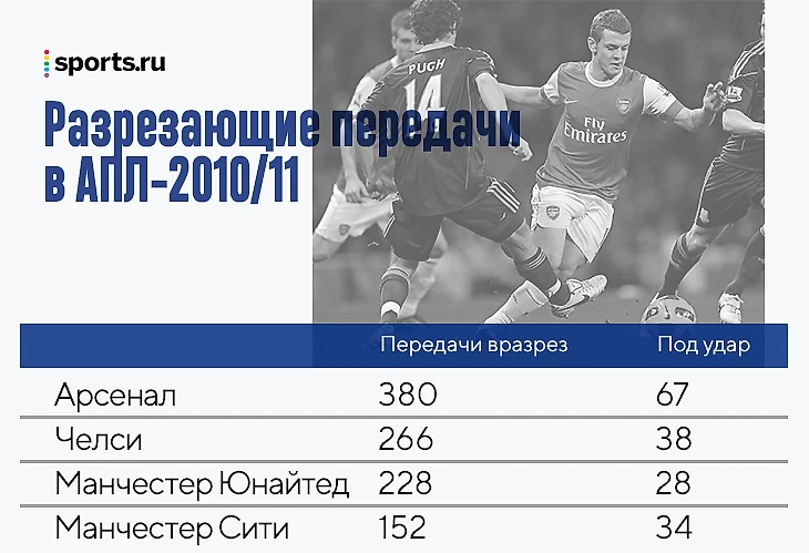 Косвенным отражением эффективности такого построения полузащиты служат обостряющие передачи вразрез. В сезоне-2010/11 «Арсенал» с гигантским отрывом лидировал и по созданным после таких пасов моментам, и по общему количеству точных разрезающих пасов (без удара сразу за пасом).