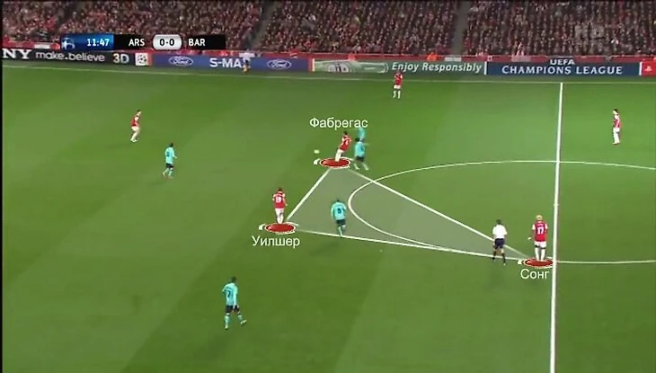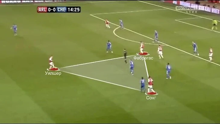 Уилшер реализовывал вариативный набор качеств через треугольник с Алексом Сонгом и Сеском Фабрегасом, который был основан на тотальной ротации. Формально Сонг и Уилшер располагались глубже, а Фабрегас стартовал в роли десятки. На практике шла постоянная смена позиций – даже Сонг не был прикован к месту в опорной: