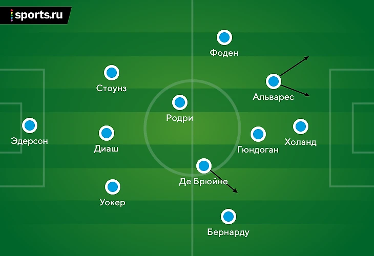 – гибридную роль получили сразу два игрока. Задачей Де Брюйне была поддержка в опорной и на правом фланге, задачей Альвареса – открывания в штрафной и помощь Фодену слева.