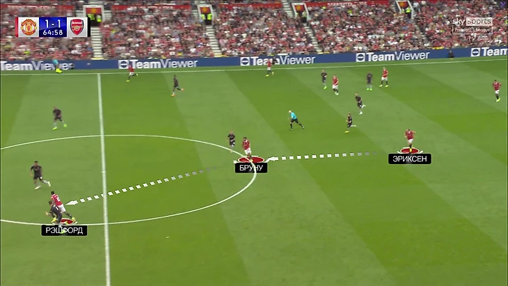 Бруну Фернандеш и Эриксен – мастера этого ремесла. В каждой из упомянутых попыток вскрывать пасами за спину участвовал кто-то из них. В голе поучаствовали оба – вертикальная атака прошла через Эриксена к Бруну, который ассистировал Рэшфорду.