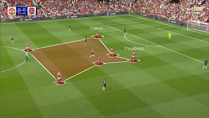 На 58-й минуте (формально еще до гола «Арсенала») Криштиану Роналду вышел вместо Антони. Еще более важным фактором была смена позиции Рэшфорда. Роналду расположился в центре, а Маркус ушел на левый фланг (Санчо – на правый). Это означало, что теперь у «МЮ» на флангах – вингеры, которые открываются на скорости, а не требуют мяч в ноги (как Антони). Намного более острый вариант для контратак.