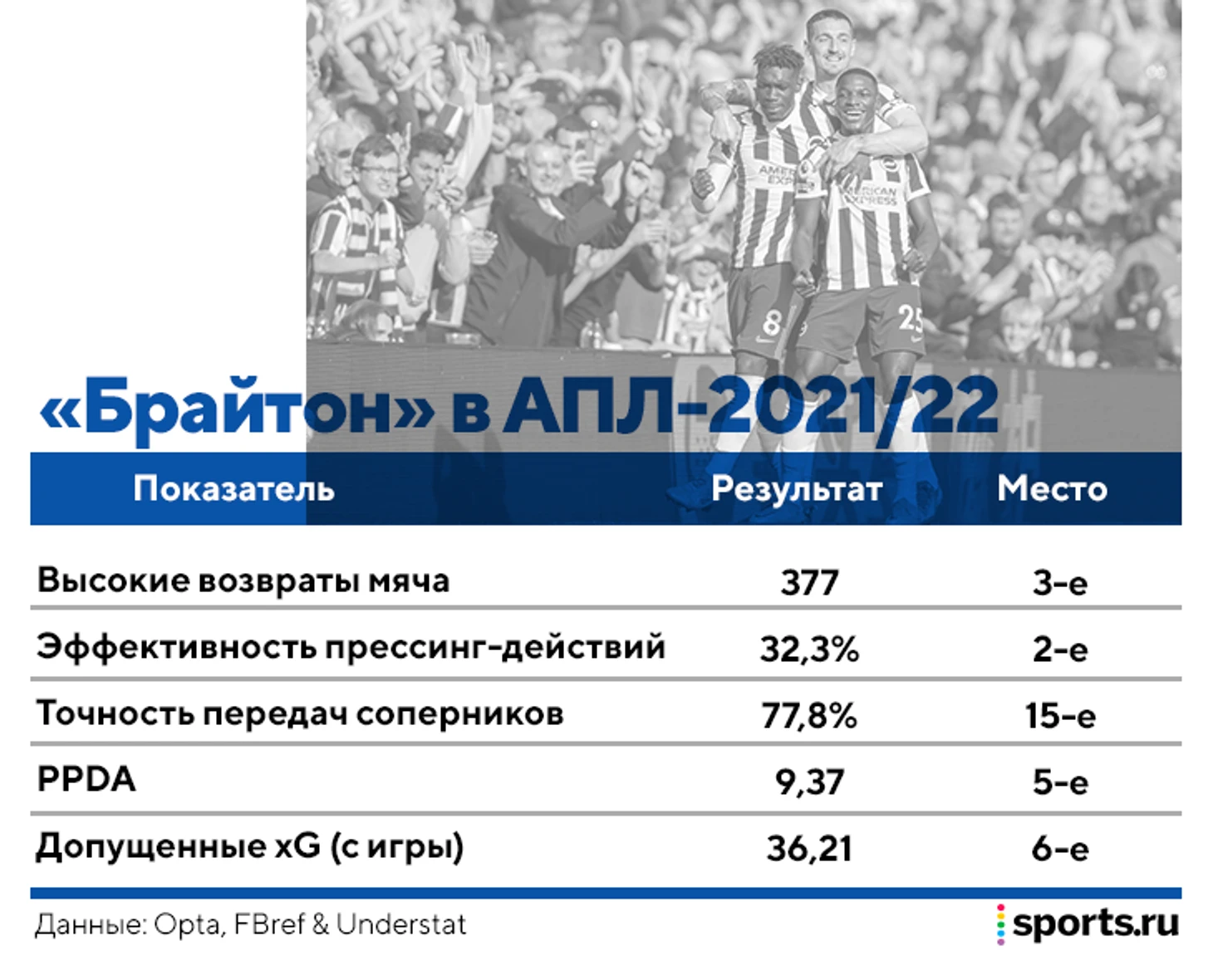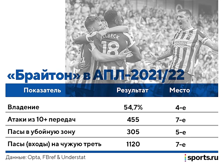 В прошлом сезоне «Брайтон» занял 4-е место по владению в АПЛ. Был очень высоко и по другим метрикам, олицетворяющим продуманность при построении атак. ресурсам.