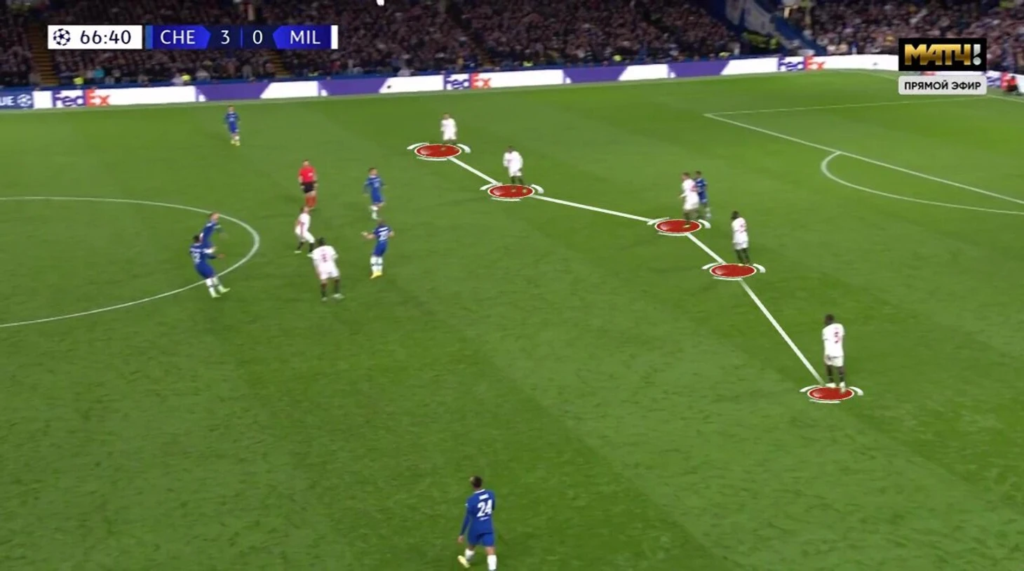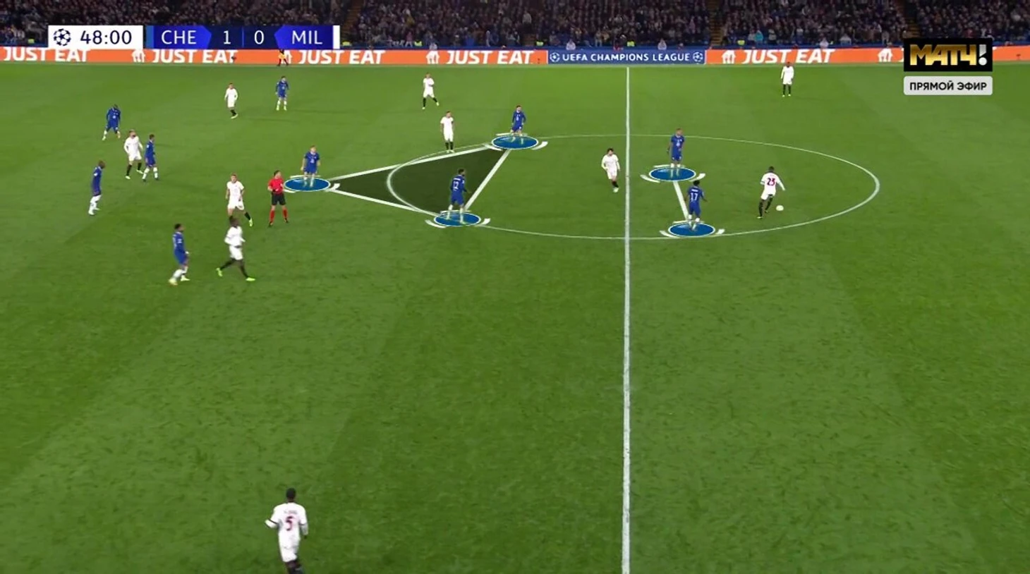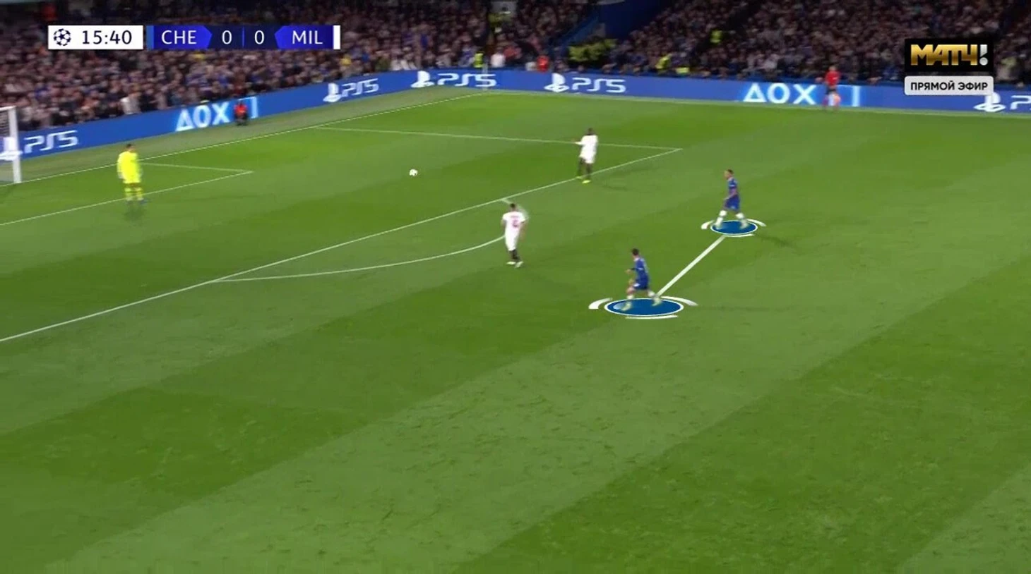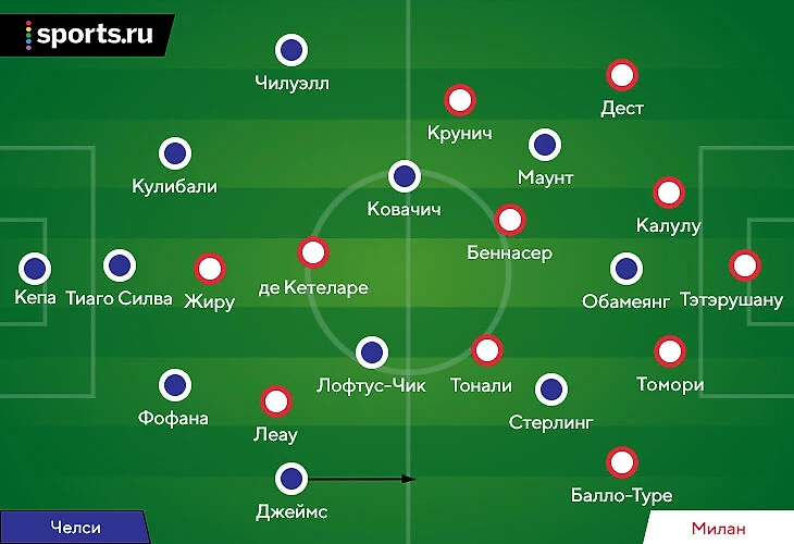 Гибридная схема (как любит Поттер) – между 3-5-2 и 3-4-2-1. В конкретном случае ход оказался очень уместным, а Стерлинг и Маунт здорово выполнили задание тренера. За всю встречу «Милан» (уступая с 24-й минуты) провел всего 2 атаки с ударами с игры и еще одну попытку добавил со стандарта.