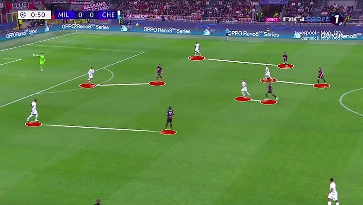 Чтобы персонально давить на «Челси», «Милан» использовал структуру, в которой треугольник в полузащите развернут вершиной вниз: пара игроков повыше (в данном случае – Крунич + Тонали), опорник пониже (Беннасер). Обычно команда использует противоположный вариант (пара опорников + десятка), но в последних матчах прибегает именно к такой структуре.