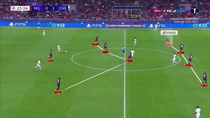 Снова отмечаем смелость «Милана» – даже после удаления не закрылись, а продолжали персонально (пусть и не всегда) давить. Теперь делали это в схеме 4-4-1 – Крунич превратился в правого защитника, а Калулу отправился в центр обороны: