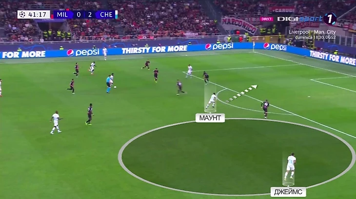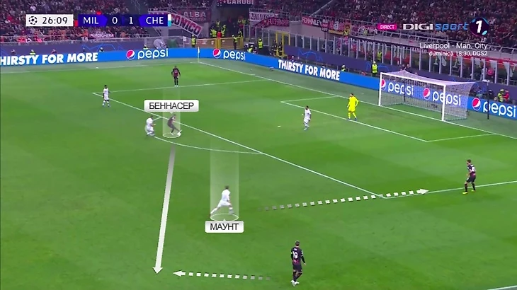 Выделим два эпизода. Сначала с отрывом лучший пас вечера от Исмаэля Беннасера – пожалуй, единственный момент, когда не Маунт обхитрил «Милан», а наоборот: