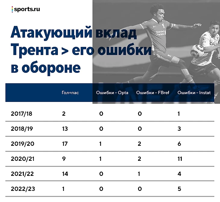 Скорее всего, ошибки у операторов пересекаются, но даже если их суммировать, получится картина в пользу Трента – 56 результативных действий против 37 ошибок. И это без учета еще одного важного контекста – большинство ошибок у ТАА приходится на кризисные сезоны (2020/21 + 2022/23) для всего «Ливерпуля».