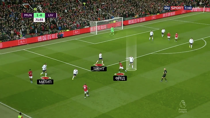 Ниже похожий эпизод трехлетней давности – только тут Тренту нужно страховать в центре защиты Жоэля Матипа (выдернулся во фланг). Важное отличие – здесь Тренту облегчает задачу партнер: Фабиньо не только передает ему Фреда, но и указывает рукой на бразильца. Трент даже здесь упустит соперника, потому что засмотрится на мяч: