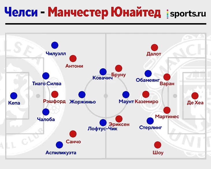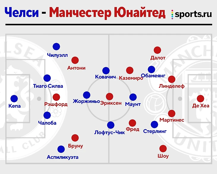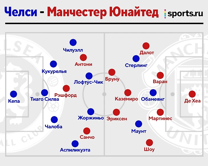 Стартовый расклад был таким: 3-4-2-1 у «Челси» против 4-3-3 «МЮ» (в старт вернулся Кристиан Эриксен, и команда акцентированно играла именно в 4-3-3, а не 4-2-3-1, как в большинстве игр сезона).