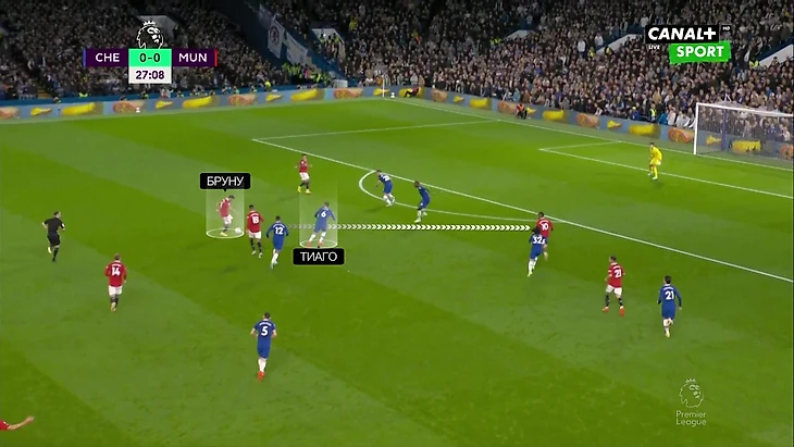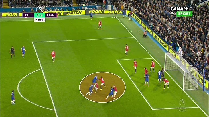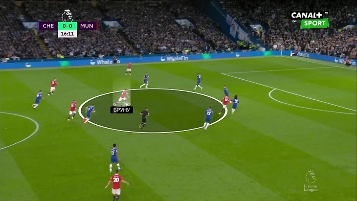 У «Челси» больше не было перевеса в центре – точно не было в ключевых зонах (Фред и Каземиро перекрывали). Частым было соотношение 4-в-4, так как Бруну смещался в центр с левого фланга.