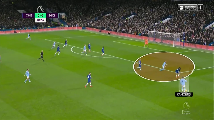 В первом тайме игрок этой позиции располагался глубже, «Сити» уверенно пасовал под давлением, но не наказывал через такие продвижения. Сейчас же «Челси» после изначального провала прессинга не успевал за атакой: