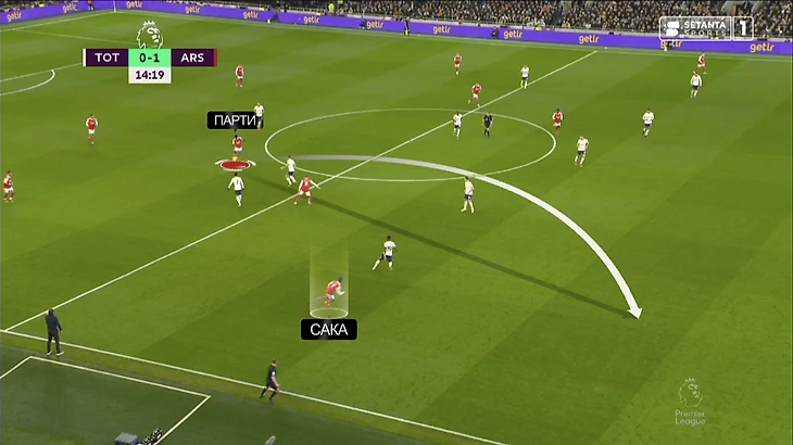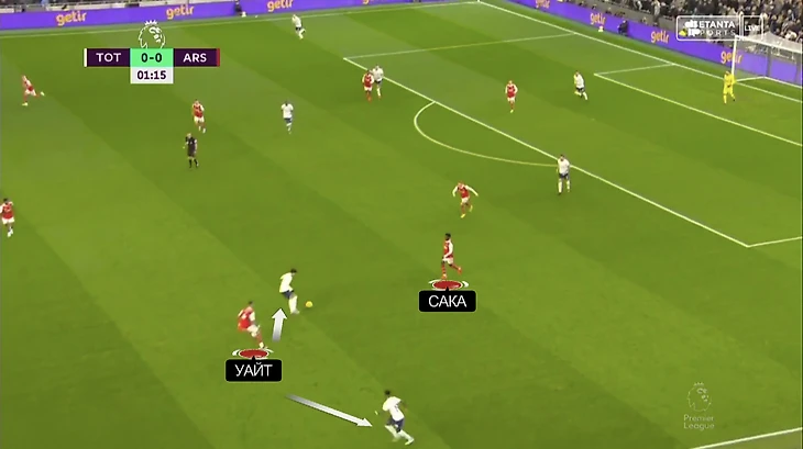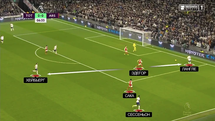 Гости быстро отреагировали. Первый вариант давления все еще использовали, но теперь его начали чередовать со вторым. В нем за Сессеньона отвечает Сака, а в атакующую тройку вместо него выдвигается Мартин Эдегор (оставляя Пьера-Эмиля Хейбьерга). Уайт мог спокойно реагировать на Сона и уже не разрывался: