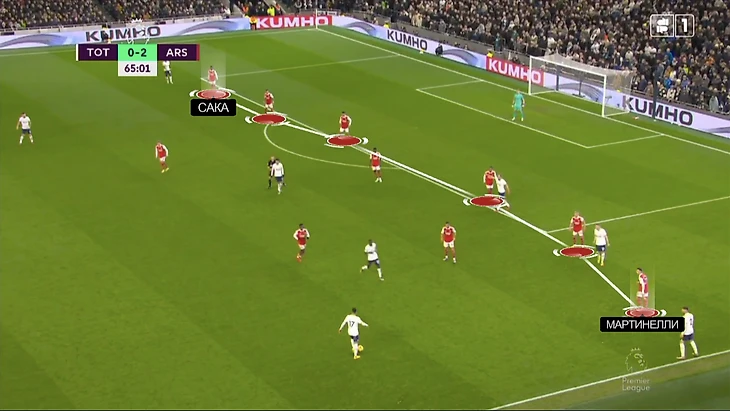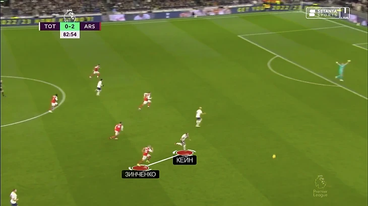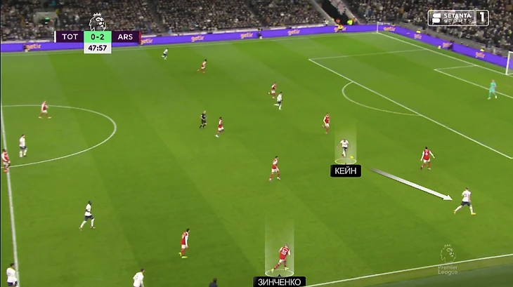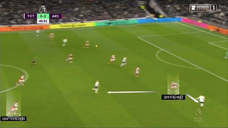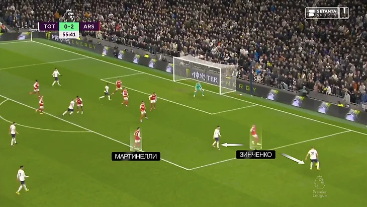 После убойного стартового отрезка «шпор» Мартинелли все чаще начал опускаться на одну линию с Зинченко – иногда шестым защитником, поскольку Сака действовал в аналогичной манере справа. Проблему не решили полностью, но как минимум затормозили скорость атак «Тоттенхэма».