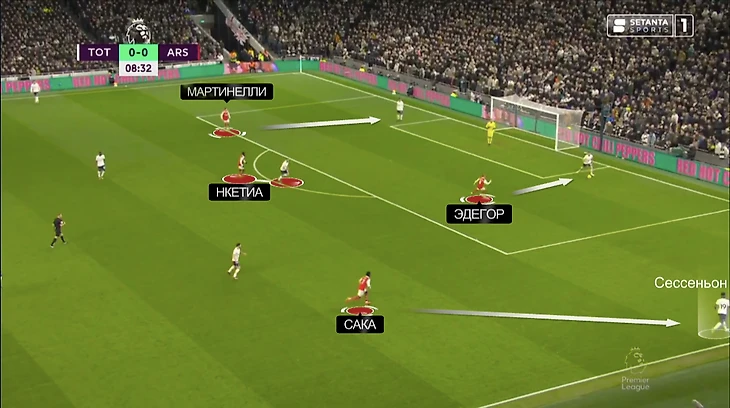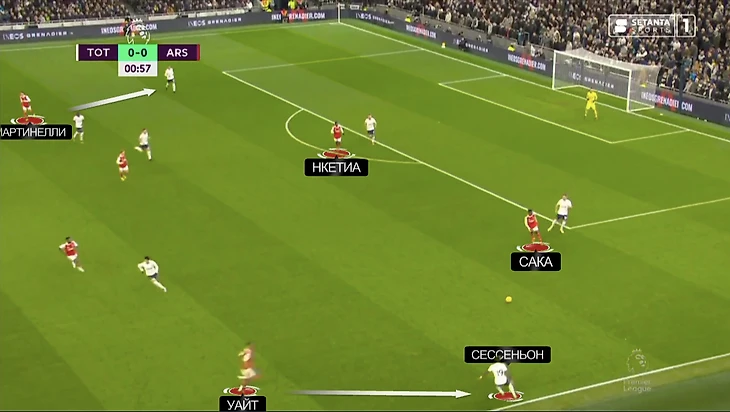 Как и на «Эмирейтс», «Арсенал» использовал разные модели давления. Кажется, стартовая исходила из наложения схем. Атакующая тройка из Мартинелли, Нкетиа и Сака прессинговала тройку центральных защитников «шпор», на латералей должны были выдвигаться крайние защитники Зинченко и Уайт.