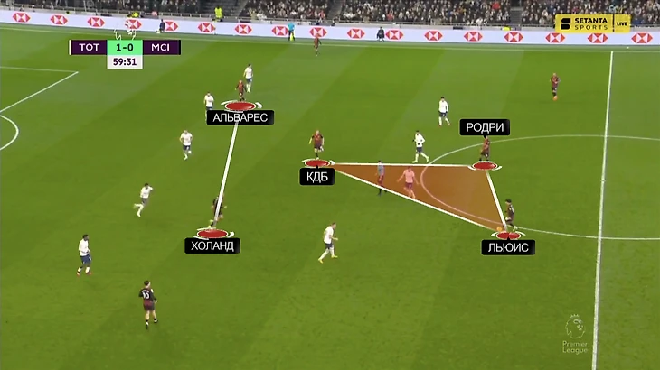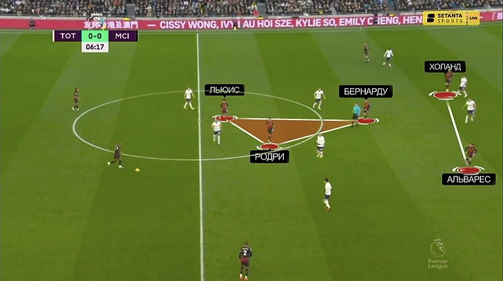 Вот пример того, как выглядела структура. В центре поля – треугольник из Родри, Льюиса и Бернарду. Чуть выше – связка Холанда и Альвареса: