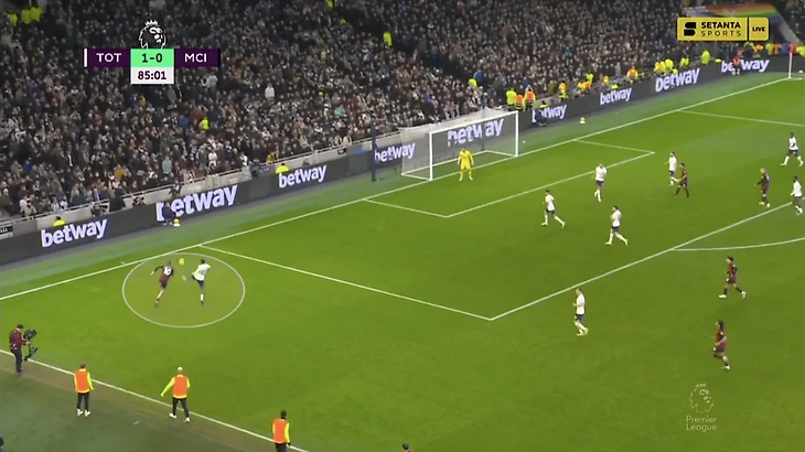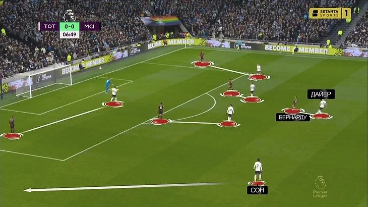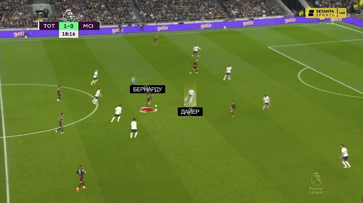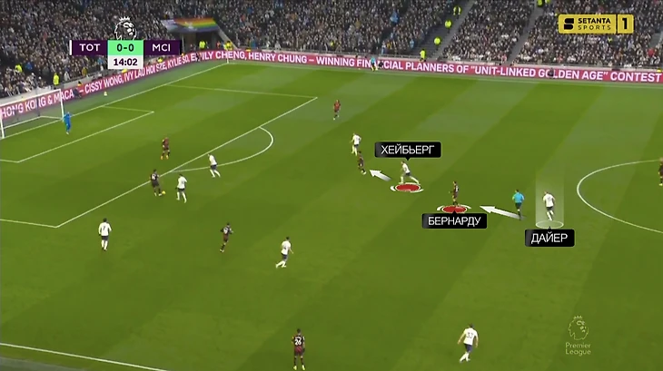 Вчера роль Гюндогана пытался исполнить Бернарду, но «шпоры» были готовы. За португальцем на постоянной основе поднимался из центра защиты Эрик Дайер. Вот эпизод в самом начале матча – Эрик выдернулся настолько высоко, что оказался к чужим воротам даже ближе Сона: