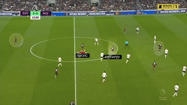 Иногда не хватало просто взаимопонимания. Тут Бернарду свободен между линиями (указывают сразу два партнера) и может спокойно разгонять атаку, но Льюис не решается пасовать: