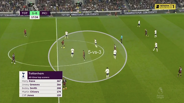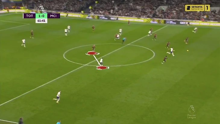 Одна из ключевых деталей последнего матча между «Сити» и «Тоттенхэмом» – ситуативный прессинг «шпор». Тогда команде Конте помогло наложение схем. Тройка нападающих Сон – Кейн – Кулусевски давила на тройку центральных защитников «Сити», пара опорников Хейбьерг – Бентанкур разбирала Родри и Рико Льюиса (заходит в опорную «Сити» при розыгрышах).