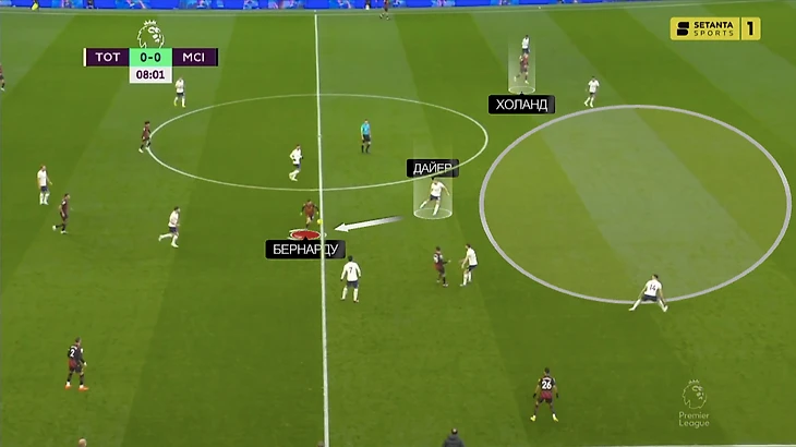 Здесь до Бернарду довели мяч. Из-за выдергивания Дайера в защите «шпор» образовалась дыра – Холанд не спешит врываться, хотя точно способен оторваться от защитника: