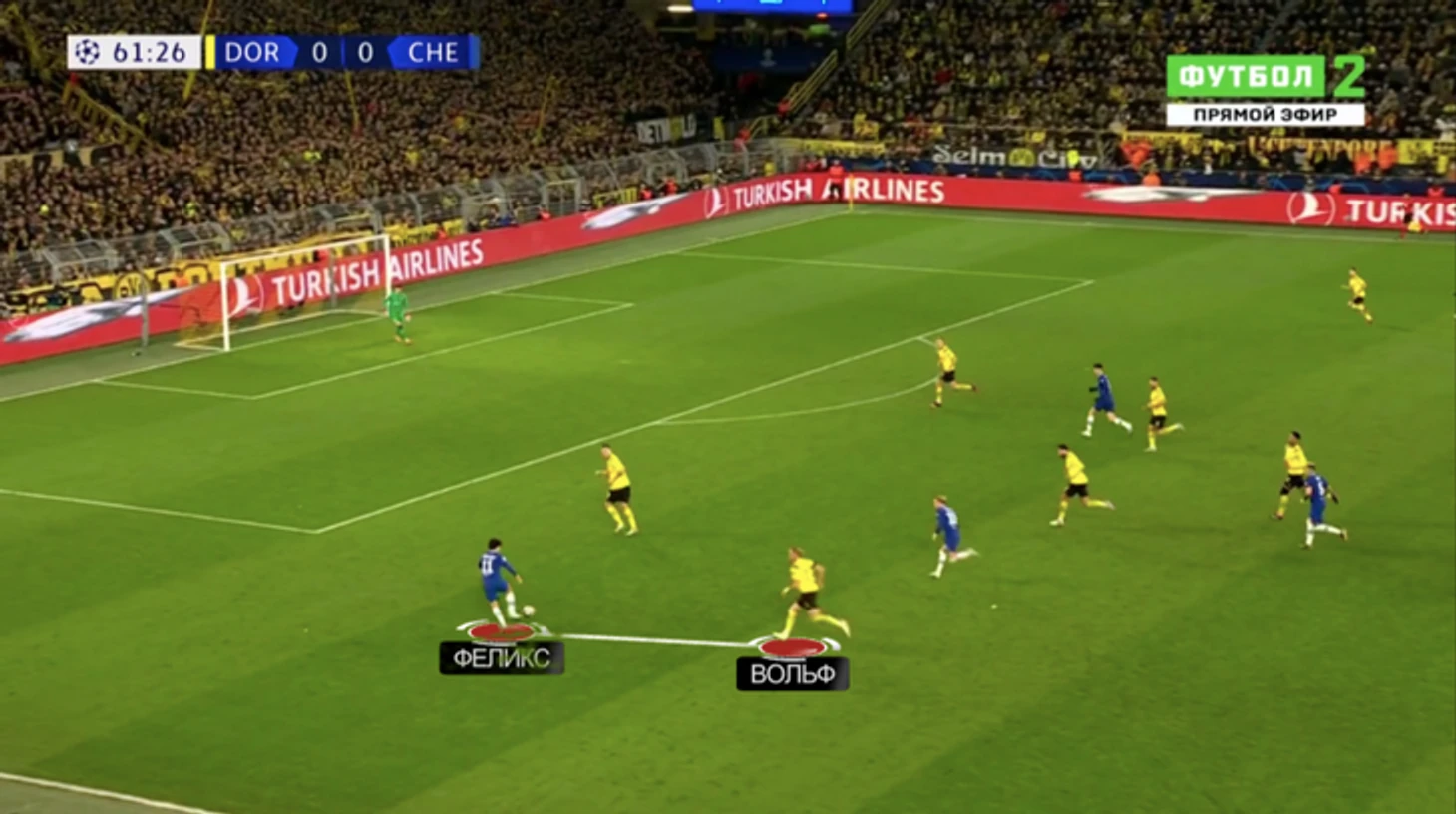 Лучшие моменты «Челси» в первом тайме (два убойных удара Феликса) пришли по одинаковому сценарию. В обоих случаях «Дортмунд» не доводил атаку по левому флангу до завершения (обрезался) – дважды «Челси» вскрывал зону Геррейру: