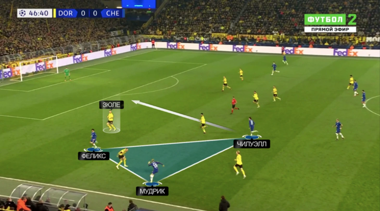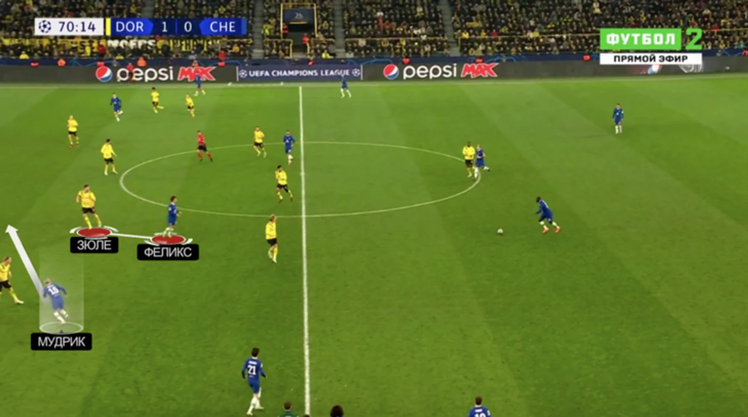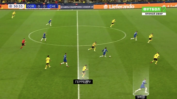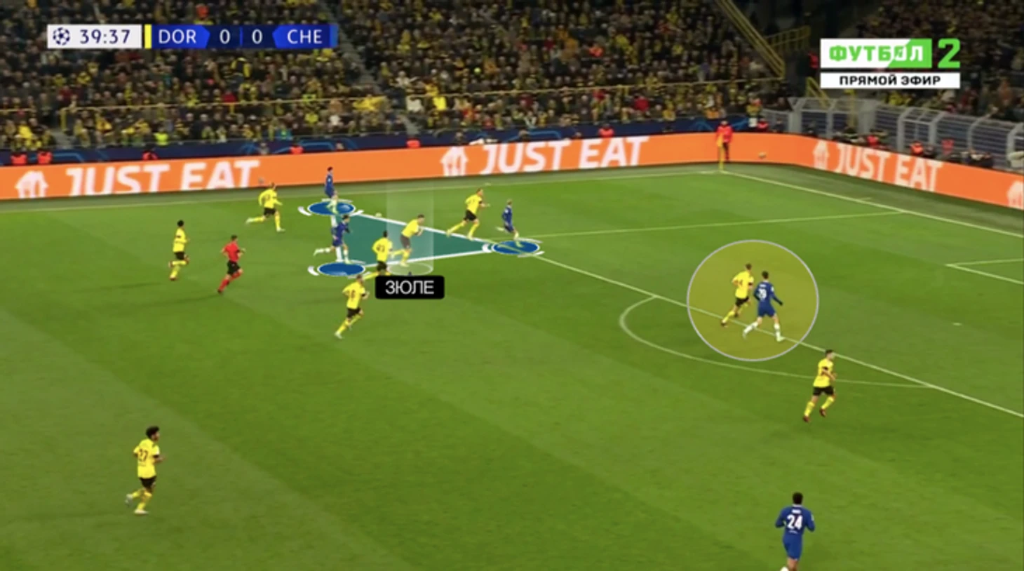 За счет дополняющих качеств получалось создавать полумоменты. Попытки «Дортмунда» сдержать треугольник оборачивались свободными зонами в других местах. Проследим на примере Зюле – защитник часто смещался к основному флангу «Челси», чтобы помочь партнерам.
