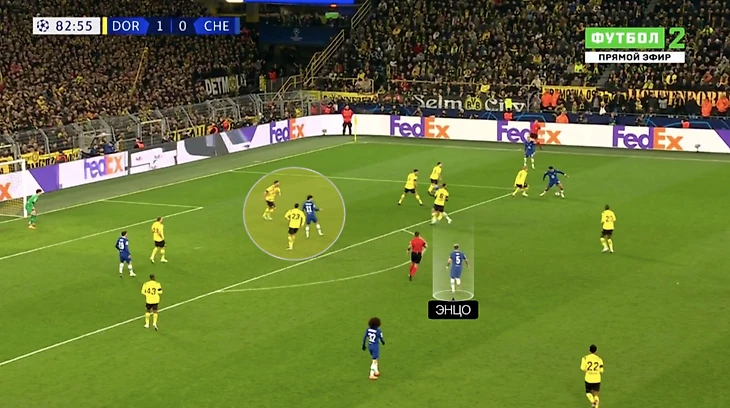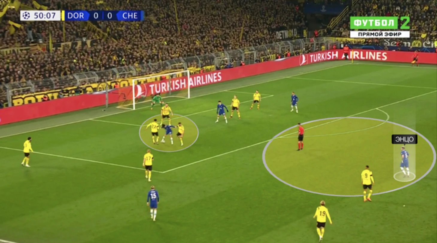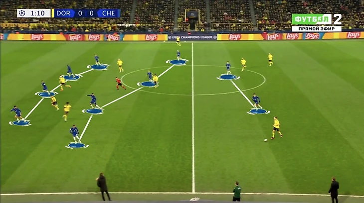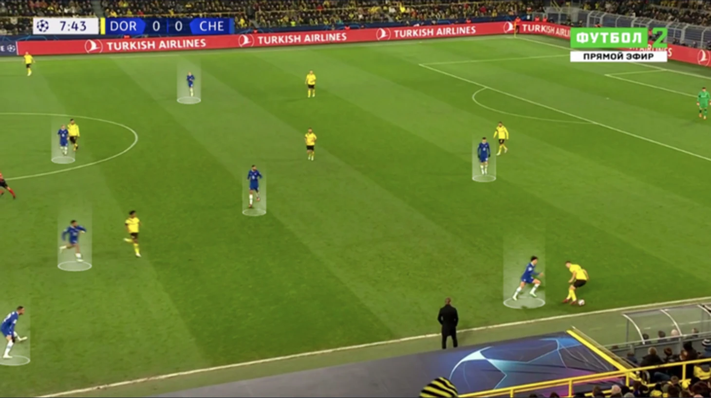 За счет дополняющих качеств получалось создавать полумоменты. Попытки «Дортмунда» сдержать треугольник оборачивались свободными зонами в других местах. Проследим на примере Зюле – защитник часто смещался к основному флангу «Челси», чтобы помочь партнерам.