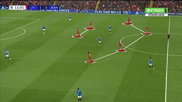 Сначала соперник легко продвигается на половину «Ливерпуля». Но продвигается лишь во фланг: