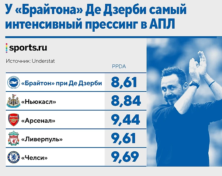 Другое дело, что за весь сезон «Брайтон» не устоял только под прессингом «Ньюкасла» – в гостевой игре, в составе, который был далек от оптимального, и против команды с бешеной мотивацией. Гораздо чаще шалости Де Дзерби приводят к моментам у чужих ворот – Гвардиола перед очной игрой подсчитал, что их у «Брайтона» в каждом матче по 20-25.