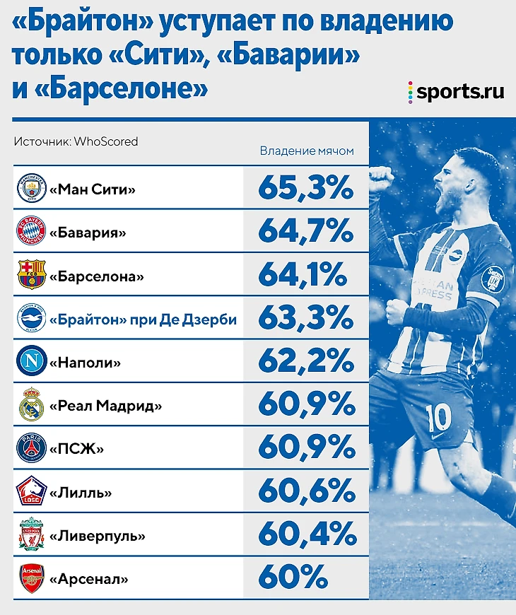 Похожий трюк Роберто провернул и с «Брайтоном». Достижение вдвойне впечатляет, учитывая, у кого Де Дзерби подхватил команду. Итальянец умудрился сделать из и так стильного середняка настоящую машину по контролю мяча. По проценту владения «Брайтон» уступает только трем клубам Европы. При Де Дзерби отдали мяч лишь в одной игре (смешно, но «Челси» Поттера).