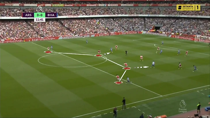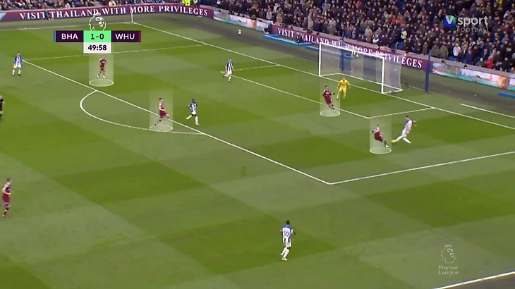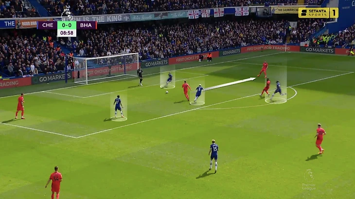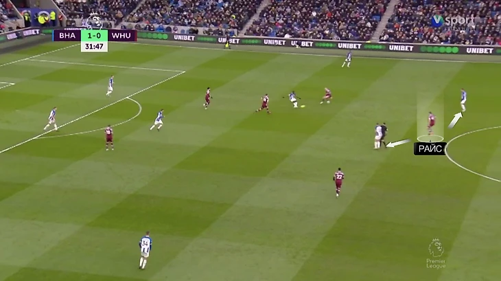 Тут у Марча и Митомы два инструмента. Во-первых, дриблинг – пользуются им, чтобы наказать соперника за отсутствие подстраховки. Во-вторых, забегания за спину – пространство обеспечивает структура «Брайтона», заставляющая соперника оголять зоны.