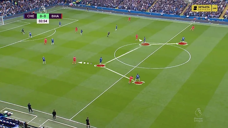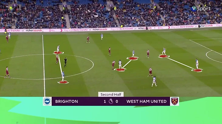 Второй вариант – разрушить схему соперника. Когда команды все же пытаются запрессинговать шестерку «Брайтона», в давлении приходится задействовать центральных защитников. От них требуются выдвижения вперед.