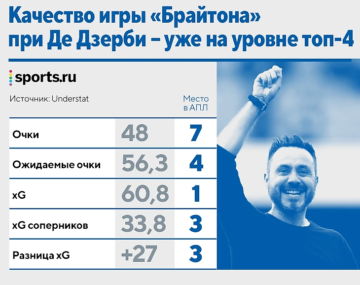 Если бы не ограниченность ресурсов и старые проблемы «Брайтона» с реализацией, Де Дзербибол мог вывести клуб даже в Лигу чемпионов. Итальянец не просто играет в манере топ-клуба, но еще и гарантирует топовое качество игры. По ожидаемым очкам на отрезке с Де Дзерби «Брайтон» – четвертая команда в лиге и обгоняет «Манчестер Юнайтед» с «Ливерпулем».