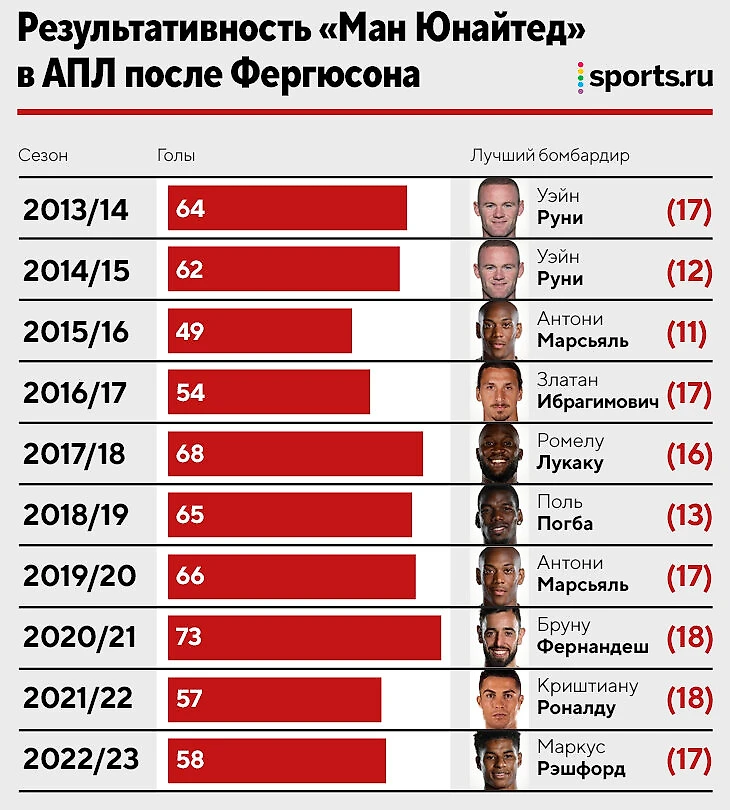 «Юнайтед» в прошлом сезоне АПЛ забил всего 58 голов – меньше любой команды в верхней шестерке. После ухода Алекса Фергюсона команда пробила планку в 70 забитых всего раз − в сезоне-2020/21.