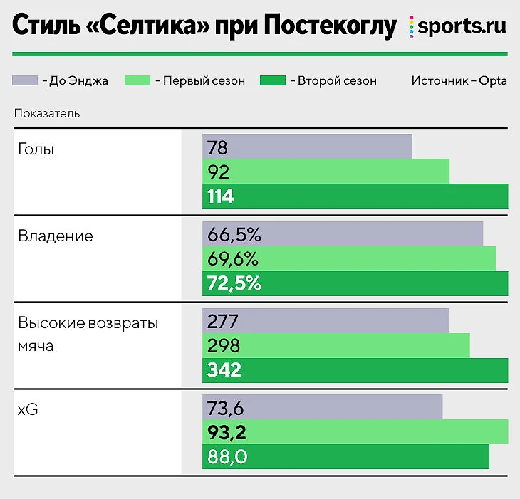 Постекоглу определенно можно назвать прагматиком. Его ценности – тотальные прессинг и владение. «Селтик» всегда доминирует почти в любой статистике, но даже такую команду Постекоглу сделал более радикальной, чем обычно: