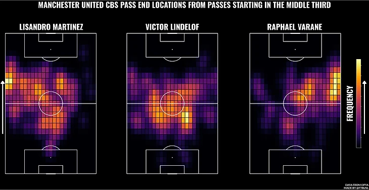 Даже если центральные защитники поднимаются высоко, они не дают продвижения. Это хорошо видно по карте точек, в которые доходят передачи центральных защитников «Юнайтед» в этом сезоне (учитываются передачи из центральной трети поля).