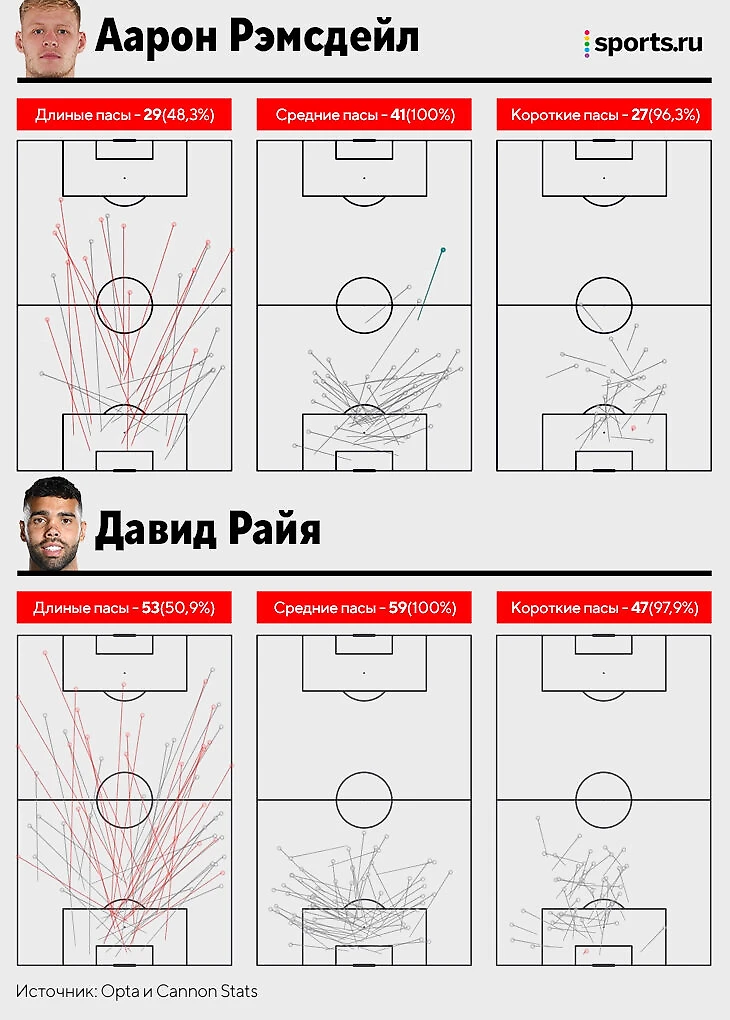 Райя значительно чаще пасует. Разница наиболее заметна при дальних передачах: в среднем за 90 минут испанец выполняет на 7 таких пасов больше, чем Рэмсдейл (16,5 против 9,5). И делает это точнее.