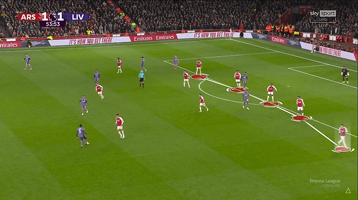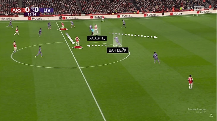 Во-вторых, Хавертц часто менялся позициями с Мартинелли. Сам уходил налево, а бразилец превращался в нападающего с классическими для этой позиции навыками (рывки за спину). Один из примеров такого размена – второй мяч «Арсенала». Да, пришел после ошибки Ван Дейка и Алиссона, но давление на них оказал именно скоростной Мартинелли.