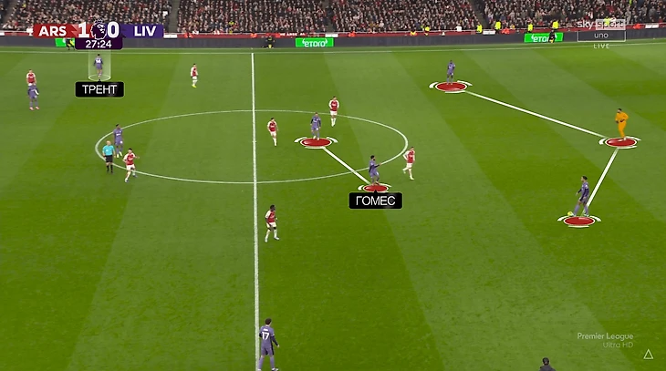 В итоге Мак Аллистеру помогали разыгрывать двое – либо Джо Гомес, либо Кертис Джонс. Независимо от варианта, Трент оставался в широкой позиции на фланге: