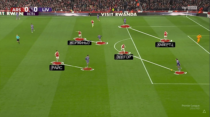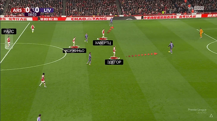 Хамелеонство Артеты против «Ливерпуля» проявилось в поведении «Арсенала» без мяча. При равном счете хозяева в смелой манере прессинговали. Паттерны из кубкового матча, где «Арсенал» тоже был агрессивен, перенеслись на новую встречу. Алгоритм в центральной зоне: нападающий (в этот раз Кай Хавертц) и Мартин Эдегор давят на пару центральных защитников «Ливерпуля», опорника прихватывает Жоржиньо. Деклан Райс выбирает – либо страховать партнеров: